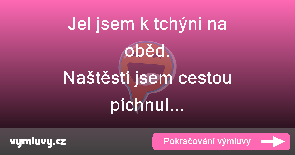 Zaslechl si jinou, lepší výmluvu? Poděl se o ní se svými přáteli i s námi. Svou výmluvu můžeš snadno přidat na tento web.
