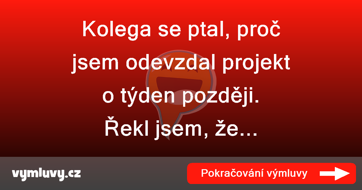 Zaslechl si jinou, lepší výmluvu? Poděl se o ní se svými přáteli i s námi. Svou výmluvu můžeš snadno přidat na tento web.